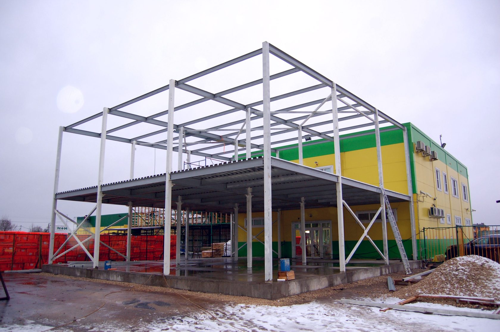 Металлокаркас — это основа всей конструкции. Он изготавливается из профильных стальных труб или двутавров, прошедших обработку от коррозии и покрытых защитным слоем цинка.